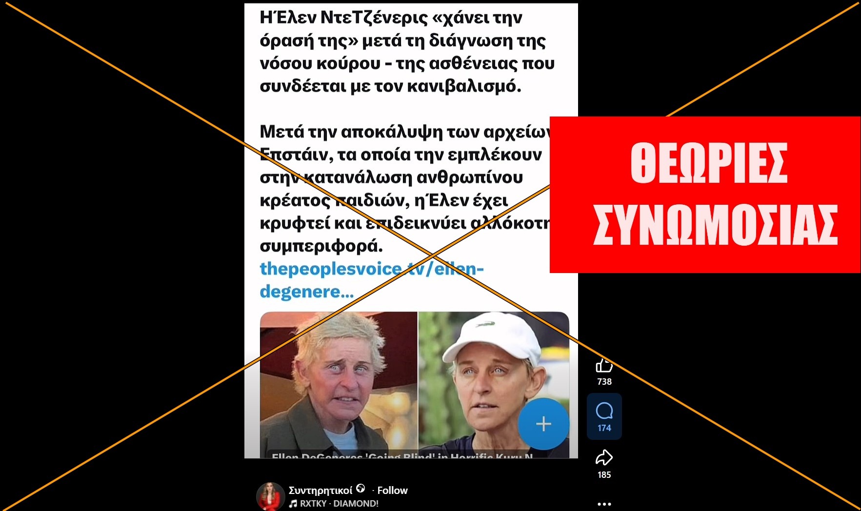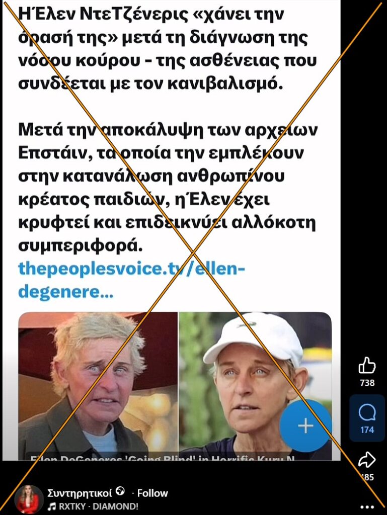 ΣΥΜΠΕΡΑΣΜΑ: Η πηγή του ισχυρισμού είναι γνωστή για παραπληροφόρηση και έχει ιστορικό δημοσίευσης ψευδών ειδήσεων και θεωριών συνωμοσίας. Τα αρχεία Epstein αναφέρουν το όνομα της ΝτεΤζένερις χωρίς καμία κατηγορία για κανιβαλισμό, κακοποίηση ή εγκληματική δραστηριότητα. Επιπλέον, η νόσος Kuru δεν προκαλεί τύφλωση (τα κύρια συμπτώματά της είναι αταξία και τρέμουλο), είναι εξαιρετικά σπάνια σήμερα και δεν υπάρχει καμία αξιόπιστη ιατρική επιβεβαίωση ότι η Έλεν ΝτεΤζένερις πάσχει από αυτήν.