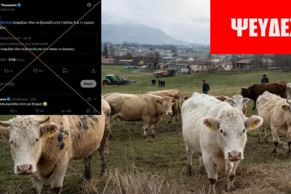 ΙΣΧΥΡΙΣΜΟΣ: Έσφαξαν όλα τα βοοειδή στη Γαλλία. ΣΥΜΠΕΡΑΣΜΑ: Ενώ έχουν θανατωθεί τουλάχιστον 3.300 ζώα στη Γαλλία, λόγω της Οζώδους Δερματίτιδας των Βοοειδών, μέχρι τα μέσα Δεκεμβρίου 2025 και έχουν καταγραφεί 117 εστίες μέχρι τις 9 Ιανουαρίου 2026, αυτό δεν αντιπροσωπεύει μαζικές σφαγές βοοειδών. Ο συνολικός πληθυσμός ανέρχεται σε περίπου 16 εκατομμύρια ζώα. Ο ισχυρισμός αναπαράχθηκε…