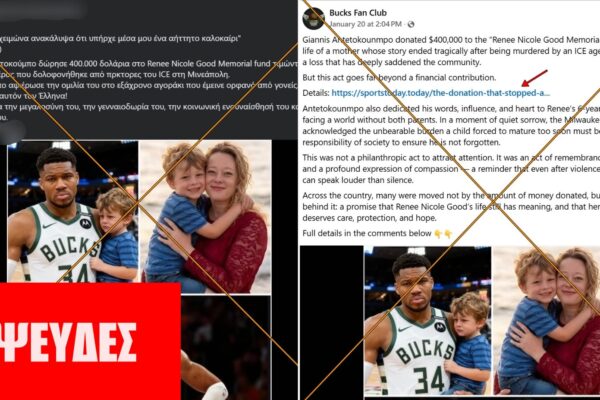 ΙΣΧΥΡΙΣΜΟΣ: Ο Γιάννης Αντετοκούνμπο δώρισε 400.000 δολάρια στο «Renee Nicole Good Memorial Fund», τιμώντας τη ζωή μιας μητέρας της οποίας η ιστορία τελείωσε τραγικά μετά τη δολοφονία της από πράκτορα του ICE στη Μινεάπολη. ΣΥΜΠΕΡΑΣΜΑ: Η ιστορία ξεκίνησε από κακογραμμένο άρθρο σε αμφιβόλου ποιότητας ιστοσελίδα. Κατόπιν κυκλοφόρησε σε αγγλόφωνη σελίδα στο Facebook που αναρτά τέτοιο…