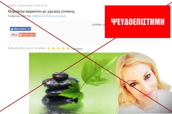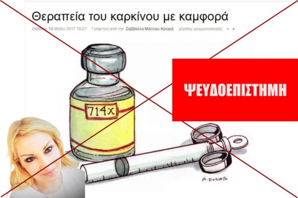 Η γνωστή (και μέσα από την αρθρογραφία μας) ογκολόγος Σαββούλα Μάλλιου-Κριαρά, φαίνεται πως αρέσκεται στο να “διαφημίζει” αντιεπιστημονικές μεθόδους θεραπείας του καρκίνου. Και γιατί να μην το κάνει άλλωστε, αφού ο Ιατρικός Σύλλογος Αθηνών, μάλλον έχει πιο σοβαρά ζητήματα να ασχοληθεί από τη προστασία της δημόσιας υγείας που ενδέχεται να κινδυνεύει από τις ψευδοεπιστημονικές αξιώσεις…